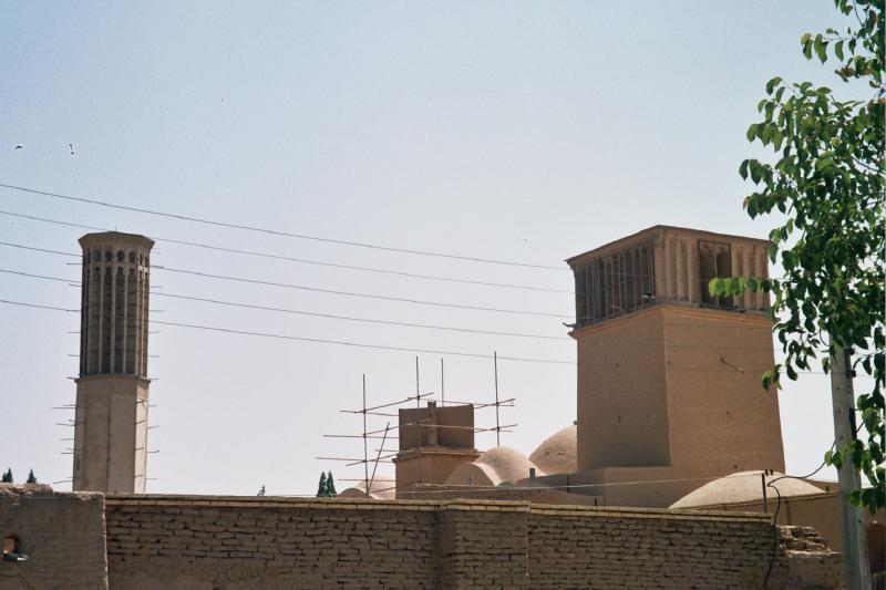 Pero la verdad es que las construcciones de Yazd son un ejemplo de buena adaptación al entorno y arquitectura sostenible. Dos de los elementos más destacados de las casas construidas con adobe en Yazd son las cúpulas circulares y las famosas torres de ventilación (bagdir). Estas últimas se utilizan, como el nombre indica, como sistema de ventilación de las casas, mucho más eficientes silenciosas y ecológicas que nuestros sistemas de aire acondicionado.