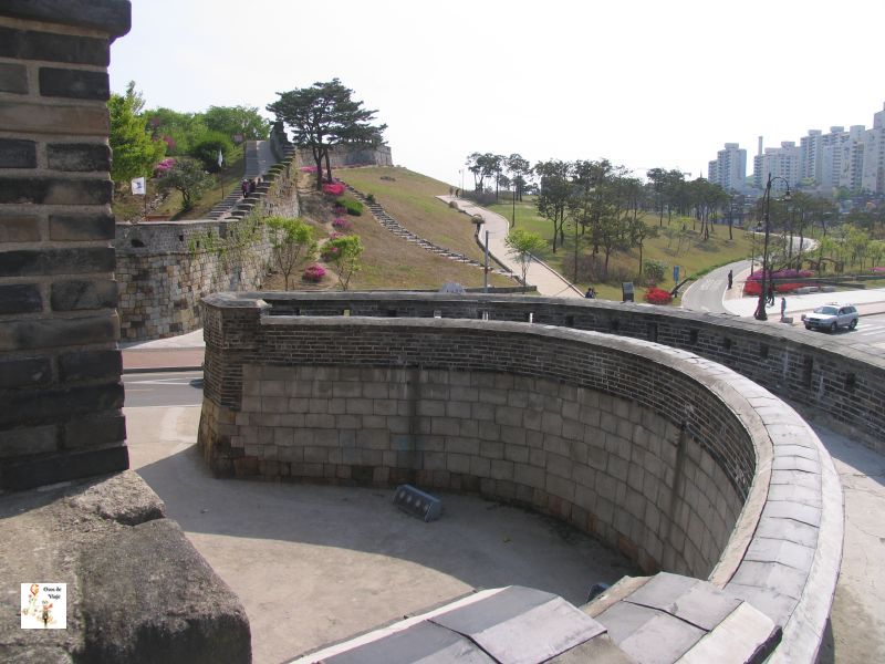 Por último, nos dirigimos al sur hacia la población de Suwon para visitar la fortaleza de Hwaseong. Para llegar a Suwon hay que coger la línea 1 del metro de Seúl hasta Suwon. El trayecto dura aproximadamente una hora. Una vez en Suwon, después de salir de zona de las vías, hay que buscar la salida de la izquierda (siguiendo la dirección de las vías) que atraviesa un centro comercial enorme. A la salida, hay una oficina de turismo que os proporcionará un mapa de la fortaleza y os indicará que autobús coger. La parada de autobuses está justo en la plaza. Los autobuses 11 o 13 van bien para llegar hasta la fortaleza. El trayecto hasta el Palmaldun, la puerta sur de la fortaleza, dura unos 10 minutos. La reconociereis sin problemas, es una enorme puerta de estilo oriental de aspecto antiguo y pomposo. Al llegar al Palmaldun hay que bajar del autobús y cruzar la plaza para llegar a las escaleras de la muralla. La fortaleza de Hwaseong fue construida entre 1794 y 1796 para proteger la ciudad. Es considerada una obra maestra en la historia de las fortificaciones. Los muros de la fortaleza rodean la ciudad y tienen una longitud de más de 5 kilómetros y medio. La fortaleza tiene cuatro puertas orientadas según los puntos cardinales. De norte a sur la fortaleza es atravesada por un riachuelo (ahí vemos el fengshui en la arquitectura de nuevo). En el punto donde el riachuelo atraviesa la muralla se construyeron unos arcos llamados Sumun. Hay diversos arcos o sumuns. La muralla se puede recorrer íntegramente a pie. Para hacer el recorrido completo se tardan unas 3 horas (y hay un buen trecho cuesta arriba). Junto al Palmaldun se encuentra otro palacio de la dinastía Joseon, el Hwaseong Haenggund.