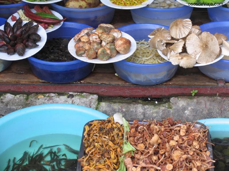 Pasemos ahora a hablar de la comida. En la ciudad antigua hay multitud de restaurantes con gran variedad de comida. A menudo los restaurantes exponen sus productos frescos (verduras y setas) en la entrada del local. Lo único que tenemos que hacer para comer es señalar lo que queremos y (opcionalmente) como queremos que nos lo preparen. En yu er lu junto a yu er park (esquina noroeste) hay un buen restaurante. Lo reconoceréis porque es un local grande con un señor en la entrada con gorro de chef para atraer a los clientes. Dentro, un chico joven cocina con el wok mirando hacia la calle y el local siempre tiene gente. En el parque tienen un par de peceras con peces vivos y los niños de la familia se dedican a “pescarlos” para la cazuela. En este local no vimos nunca extranjeros pero sí multitud de chinos y la comida es excelente. También tienen una carta con algunos platos en inglés. Otra opción para comer y contratar tours es el sisters’s café en Boai lu 92 (entrando a la ciudad por la puerta oeste a 5 minutos en dirección sur). Este local es curioso porque tienen los tours que ofrecen en una especie de álbum con fotos de la gente que ha hecho el tour. Una de las chicas habla algo de inglés.