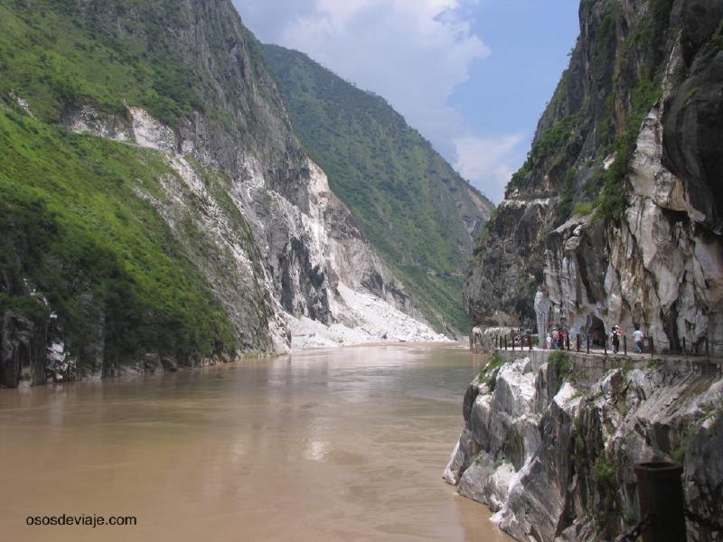 Más abajo se puede visitar la mítica garganta del tigre que salta. Se trata de un desfiladero por donde el agua del río baja con toda su fuerza. A uno de los lados de la garganta se ha excavado la roca para crear un camino que discurre junto al río. El recorrido hasta la zona de los rápidos dura una hora aproximadamente. Después hay que deshacer el camino hasta la entrada de la garganta. La garganta del tigre que salta se puere recorren utilizando dos rutas: la ruta fácil junto a la carretera, y una ruta más difícil que transcurrer unos metros por encima de la anterior, desde donde los paisajes son aún más espectaculares.