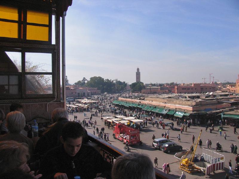 Nuestro amigo Toni nos comentó que hay que pasear por la plaza del Djemaa el Fna en diversos momentos del día, y así lo hicimos. Nada más levantarnos, nos dirigimos a través de la avenida de Mohammed V en dirección a la Kutubia, el alminar que se ve desde cualquier parte de la ciudad. En nuestro camino atravesamos las murallas que rodean la ciudad antigua. La Kutubia se halla muy cerca de la plaza del Djemaa el Fna por lo que fue nuestra primera parada. Se trata de uno de los edificios construidos por los Almorávides en su expansión hacia el norte (siglo XII) y sigue el modelo de la Giralda de Sevilla. Finalmente llegamos a La Plaza. Allí encontramos encantadores de serpientes, saltimbanquis, contadores de cuentos, mujeres que hacen dibujos con henna y diversos puestos donde se venden dátiles y otros donde se puede tomar un zumo de naranja recién exprimido por unos 10 dirhams. Alrededor de la plaza hay un montón de cafés y terrazas donde se puede hacer una parada, tomar un te a la menta y contemplar el deambular constante de gentes.