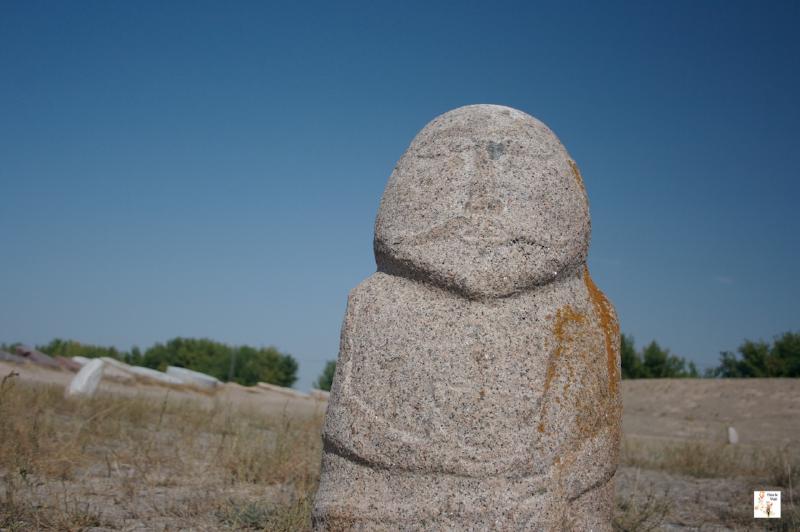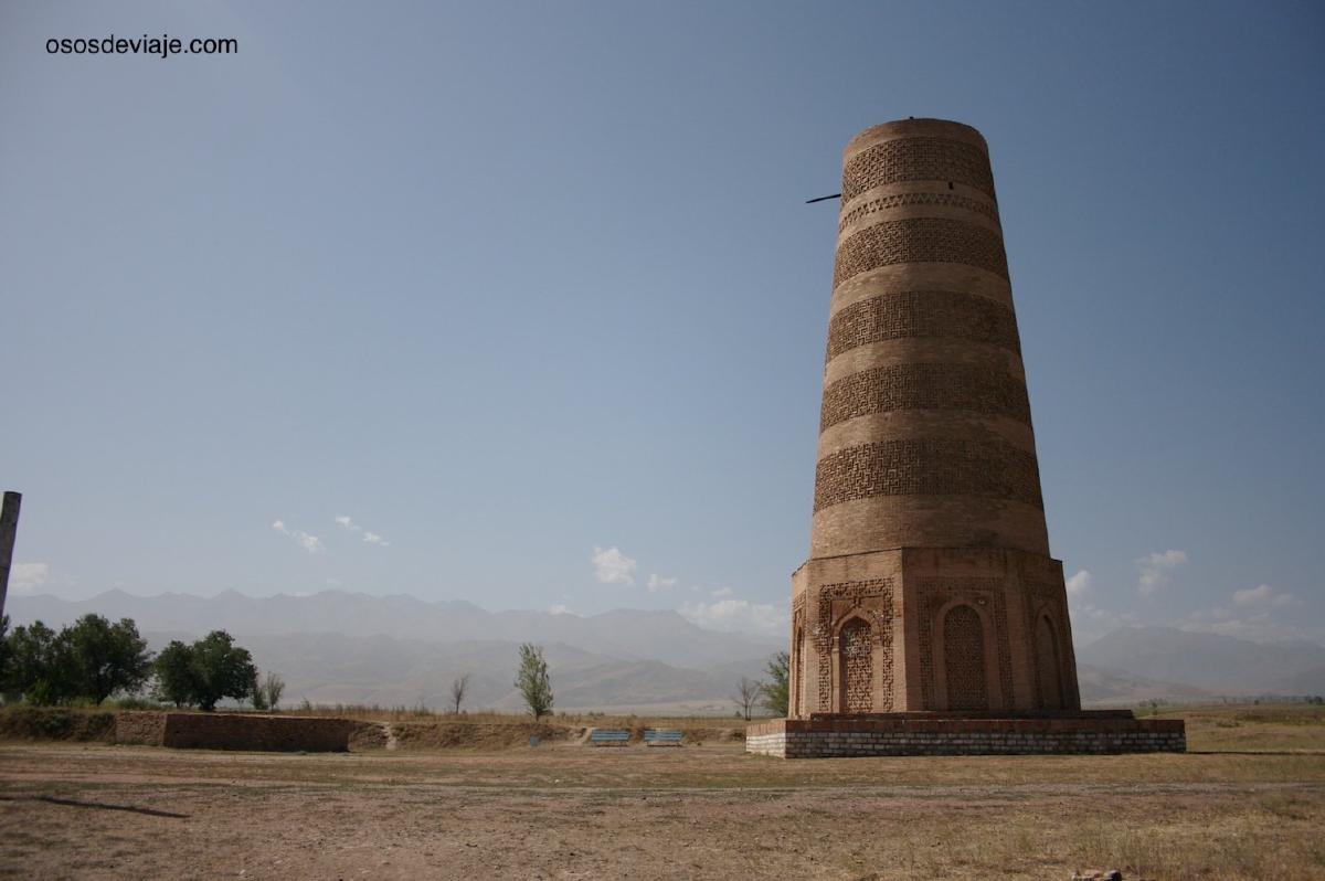 Nuestra primera parada tras salir de Bishkek fue la torre de Burana cerca de Tokmok. La torre, una pequeña parte de la muralla y poca cosa más son los restos de la antigua ciudad de Balasugan, ciudad de la ruta de la seda que data del siglo X. Se cree que la torre es uno de los minaretes más antiguos de Asia central. En Kyrgygzstan se conserva otro minarete simlar en Uzgen, en el sur del país, cerca de la frontera uzbeka. Además de la torre a la que se puede subir y contemplar el expléndido paisaje del valle se puede visitar un pequeño museo, y una escecie de “cementerio” donde se conservan piedras con petroglifos y “Bal bals”, rocas esculpidas con cabezas humanas que se dice se encontraban a lo largo de la ruta de la seda (más información sobre la torre de Burana).