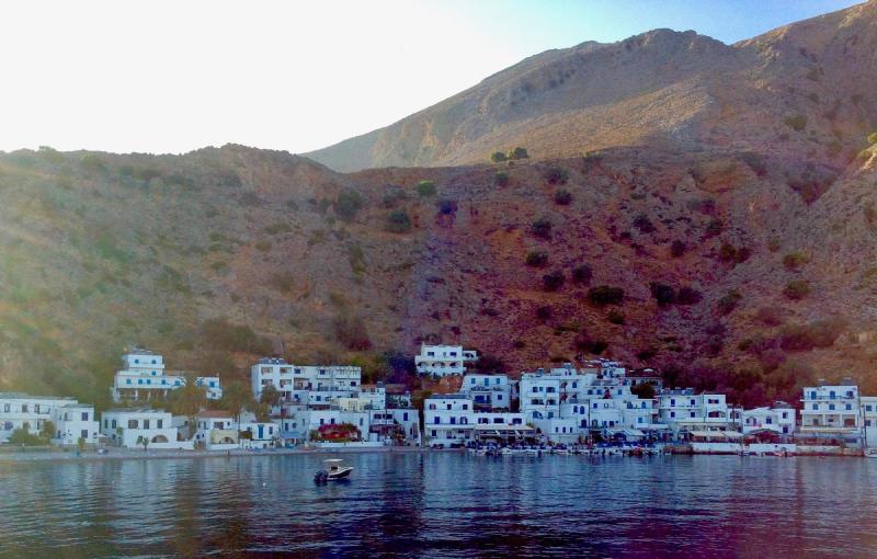 En el Ferry hacia Agia Roumeli pasamos un el pintoresco pueblo de Loutro. Se trata de un pueblo al que sólo se puede llegar en barco o a pie. En Loutro no hay coches ni motos, tan solo un vehículo para el transporte de mercancías entre los hoteles.