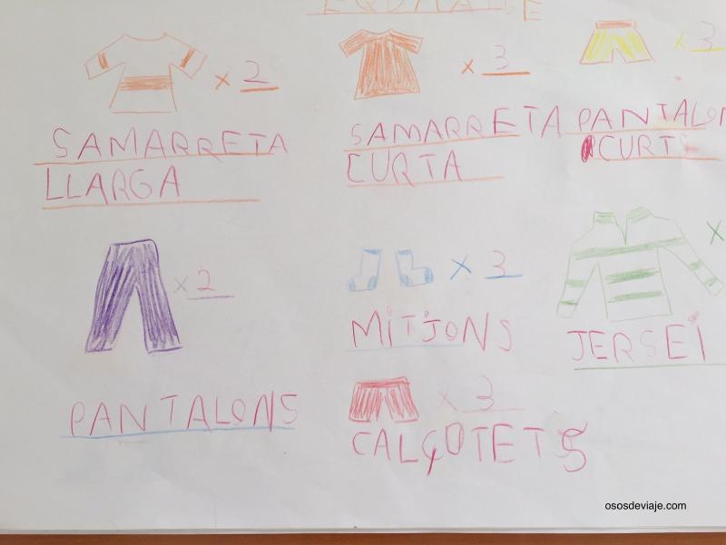 - Preparamos una lista con las cosas que los niños deberían guardar en su maleta. En nuestro caso hemos optado por una versión visual con dibujos de las prendas de ropa que han de guardar así como algún juguete y cuentos.