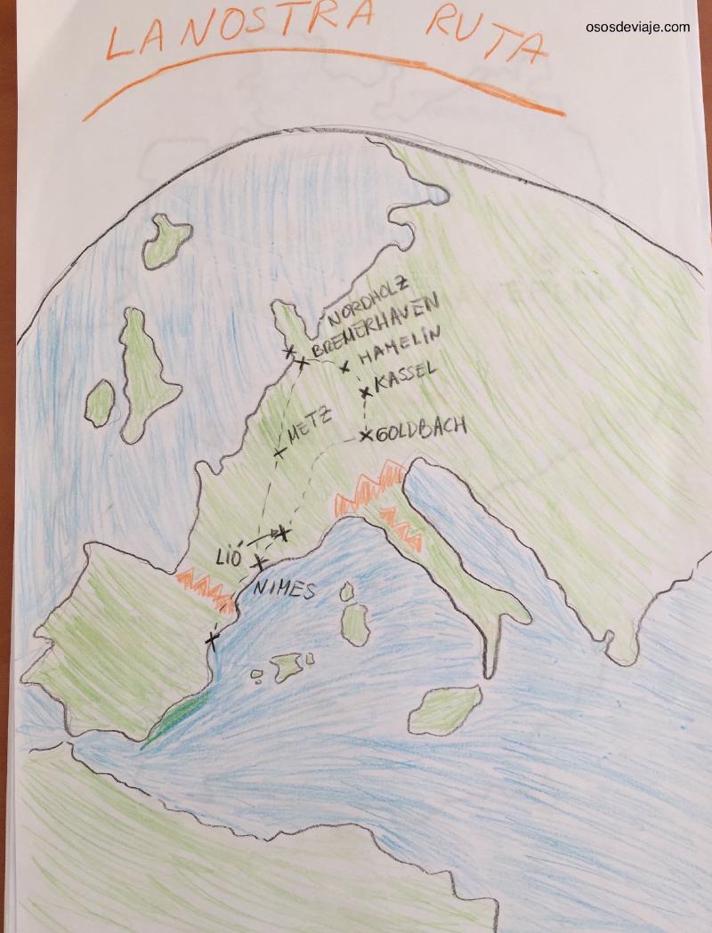 - Un mapa de la ruta o destino. Hemos dibujado un mapa hecho a mano de nuestra ruta con las paradas más importantes.
