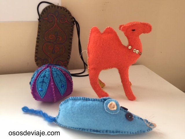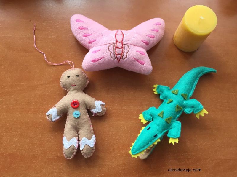- Objetos que he elaborado específicamente para el calendario, normalmente de fieltro. Por ejemplo el cocodrilo símbolo de la ciudad de Nimes, el dromedario que vimos en Sigean, las ratas que se llevó el flautista de Hamelín o un reno de Papá Noel.