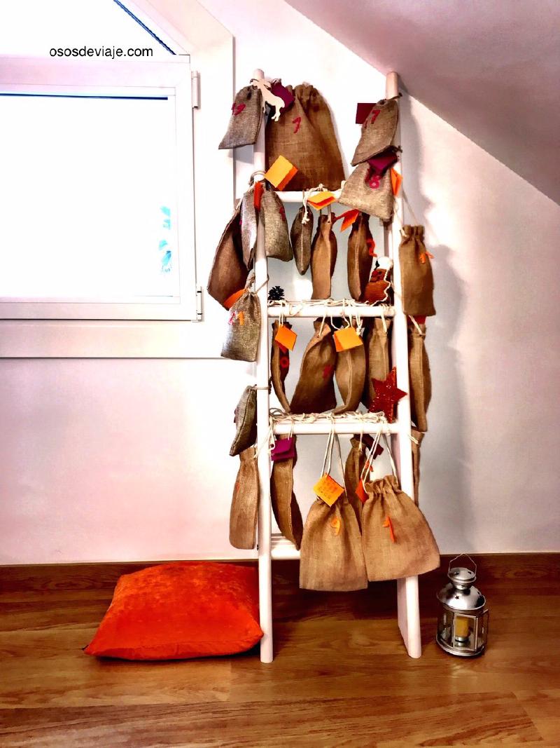 A continuación os enseñamos como ha quedado nuestro calendario de adviento. Este año hemos utilizado una escalera decorativa blanca para colocar las bolsitas.