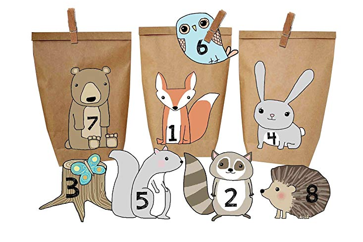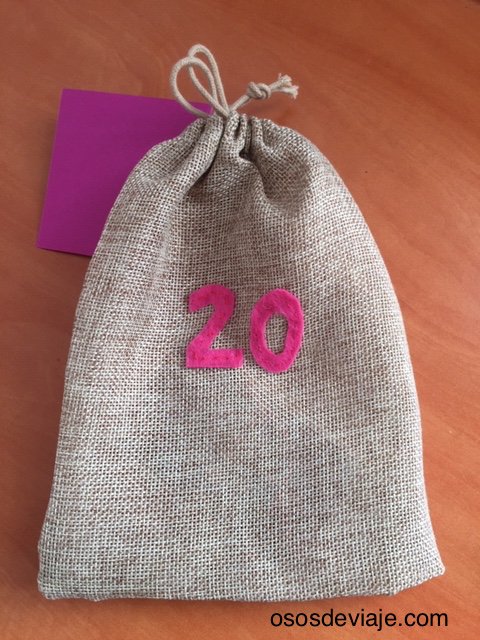 Las sorpresas las he guardado en 24 bolsitas de yute o de tela como estas. Las sorpresas las he colocado en las bolsitas de forma aleatoria con una nota que contiene una pista de lo que hay en cada bolsita. Los saquitos del calendario los hemos numerado porque nuestros hijos conocen los números. Si los niños no saben leer aún, se puede leer cada pista en vez de que la lean los niños.