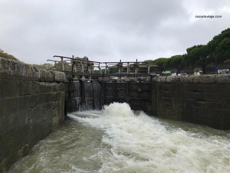 El segundo día de nuestro viaje hicimos un paseo por la ciudad nueva de Carcassone para llegar al jardín de André Chénier, situado frente a la estación de tren. Desde allí salen los barcos que navegan por el Canal y en verano también alquilan bicicletas. Aunque parte de nuestra excursión estuvo pasada por agua pudimos hacer un paseo en barcaza por el Canal de Medio Día. El recorrido matinal duró 2 horas. Una de ida y otra de vuelta. El recorrido fue en dirección noroeste y pasamos dos esclusas: la de Carcasone y la Douce donde dimos la vuelta. Los niños pudieron ver como se llenaban las exclusas para igualar el nivel de agua en ambos lados del canal y como entonces se habrían las compuertas. La guía hizo una explicación en castellano sobre la historia del canal y su situación actual.