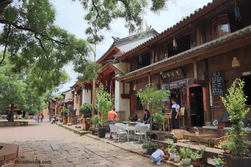 Indiscutiblemente, en la antigua plaza del mercado es donde durante siglos se concentró el centro de la actividad comercial del pueblo. En la actualidad, el mercado ha sido trasladado a otra ubicación y la antigua plaza conserva el edificio del teatro restaurado como uno de los más emblemáticos. La plaza está rodeada de pequeños comercios y bonitos edificios de madera y barro de color ocre. El templo Xingjiao es el único templo budista de los bai.