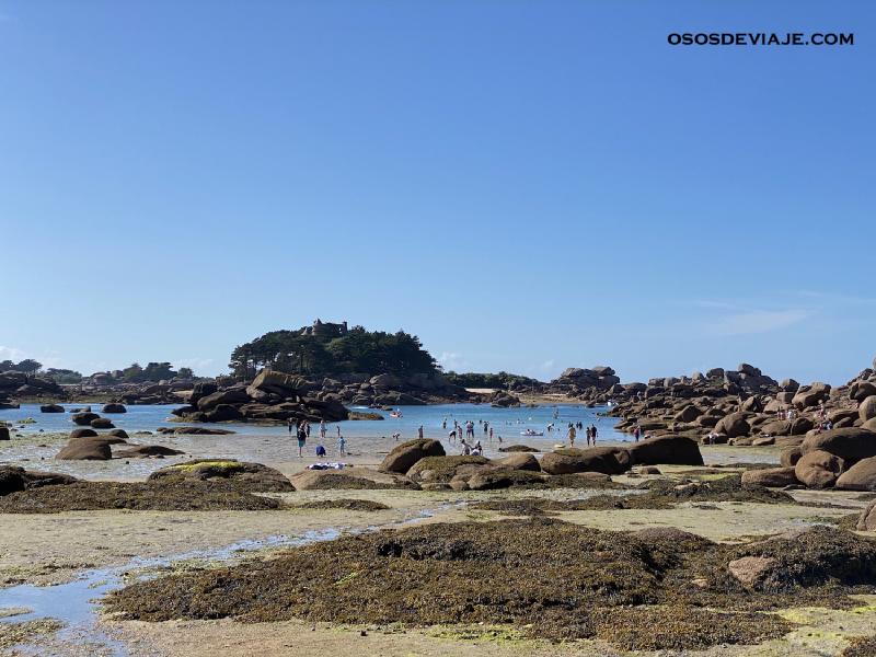 A la salida del aparcamiento hay un mapa que te permite ir hacia el GR-34, que es donde están las rocas de granito rosado. La parte de camino que hicimos nos llevó por la costa hasta el faro Mean Ruz y de allí hacia la playa de Saint-Guirec. En la propia playa hay un pequeño oratorio, que parece flotar en el mar con la marea alta y está dedicado a Saint Guirec. Desde la playa seguimos nuestra excursión hasta el cercano puerto de Ploumanac’h.