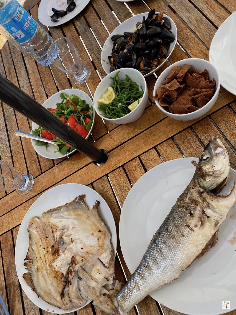 En Bretaña abunda el pescado y marisco fresco. En los supermercados y mercados se puede comprar directamente una amplia variedad de estos productos y cocinarlos uno mismo. Evidentemente también conviene degustarlos en algún restaurante y ver como los cocinan allí. Entre los frutos del mar que nos llamaron la atención está una alga llamada salicornia (“salicorn” en francés) que compramos en el supermercado. La tomamos fría aliñada con zumo de limón y aceite como ensalada acompañando unos pescados asados. Como ya estaba salada no añadimos sal. Es un alga verde crujiente y sabrosa.