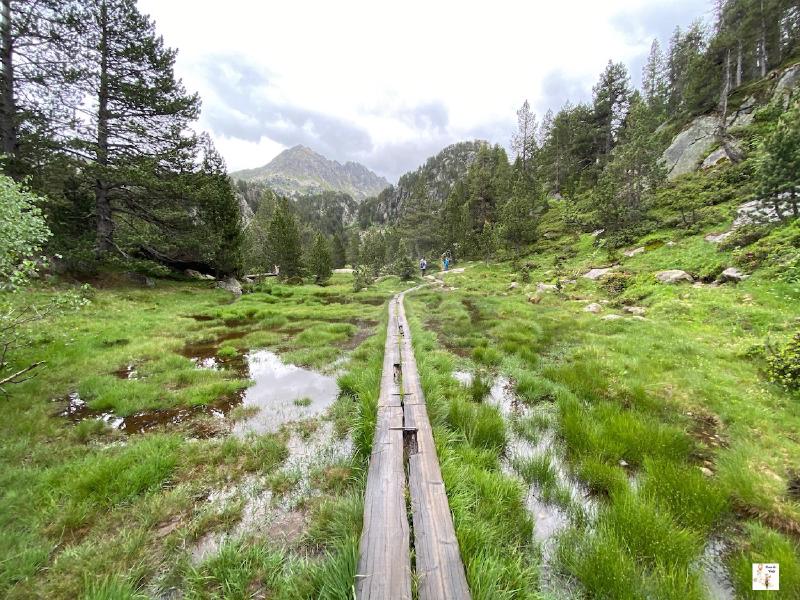 Una vez en Montanheta un cartel nos indica el inicio de la excursión que trascurre por un terreno irregular, rocoso y mojado ese día, puesto que había llovido bastante. Seguimos caminando para llegar al primer lago, el Estanh dera Lòssa. El paisaje es alpino con vegetación abundante y numerosos riachuelos. Sin duda es una de las zonas más bonitas del valle de Arán.