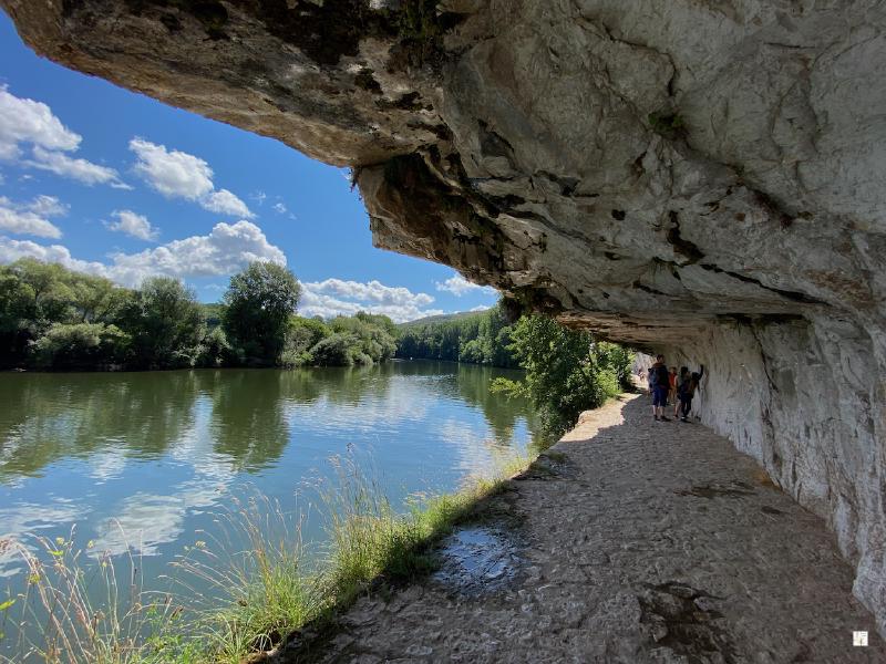 El camino es plano con la excepción de la subida y bajada a Saint Cirq. Al finalizar la bajada desde Sant Cirq, el primer tramo del camino trascurre por una pista asfaltada donde también circulan bicis. Estamos a la sobra de los árboles del bosque. Después nos acercamos al río por un tramo estrecho y sin asfaltar. Este tramo no tiene sobra. A lo lejos divisamos una colina rocosa donde está el tramo más famoso del camino. Al llegar al tramo del camino excavado en la roca encontramos la esclusa de Ganil, que permite a las gabarras llegar hasta Saint Cirq procedentes de Bouziès y volver. Un poco más adelante encontramos unas esculturas talladas en la piedra que son obra del escultor nacido en Toulouse Daniel Monnier. Estas esculturas fueron realizadas entre 1985 y 1989. Al fondo se divisa un antiguo puente metálico. Aquí decidimos dar la vuelta, es medio día y el calor empieza a apretar.