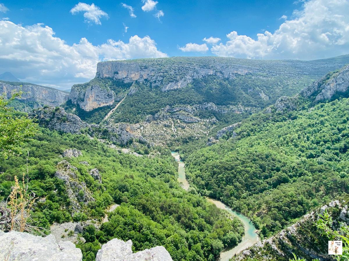 Por la tarde se despejó el tiempo así que hicimos una parte de la excursión por el sendero de les bases gorges du Verdon. Es un precioso sendero que comienza justo después del puente sobre el río Verdon a la entrada de Quinson, frente al lago. Desde allí ascienden unas escaleras que nos llevarán a contemplar la entrada de la garganta. El primer tramo trascurre junto al río. Poco después te adentras en el bosque junto al cañón y sigues caminando paralelo al río. Hay diversos miradores sobre la garganta. Nosotros recorrimos unos 2 km de ida y después deshicimos el camino. No obstante, la ruta completa son unos 9 km de excursión circular. Aquí podéis encontrar la ruta completa. Este camino era el camino de los guardas que vigilaban la garganta.
