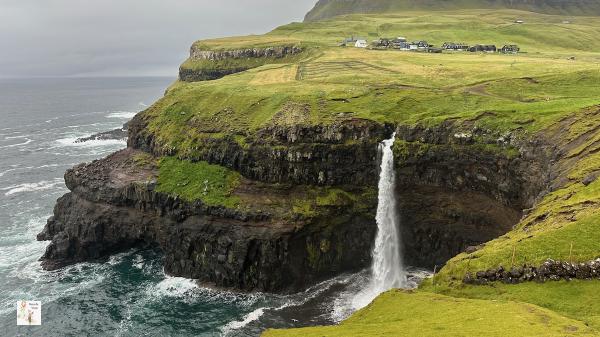 1. Gásadalur y la Cascada Múlafossur # En el pintoresco pueblo de Gásadalur, se encuentra una de los lugares más icónicas de las Islas Feroe: la cascada Múlafossur. Es espectacular salto de agua, que cae directamente al océano desde una altura de más de 30 metros.