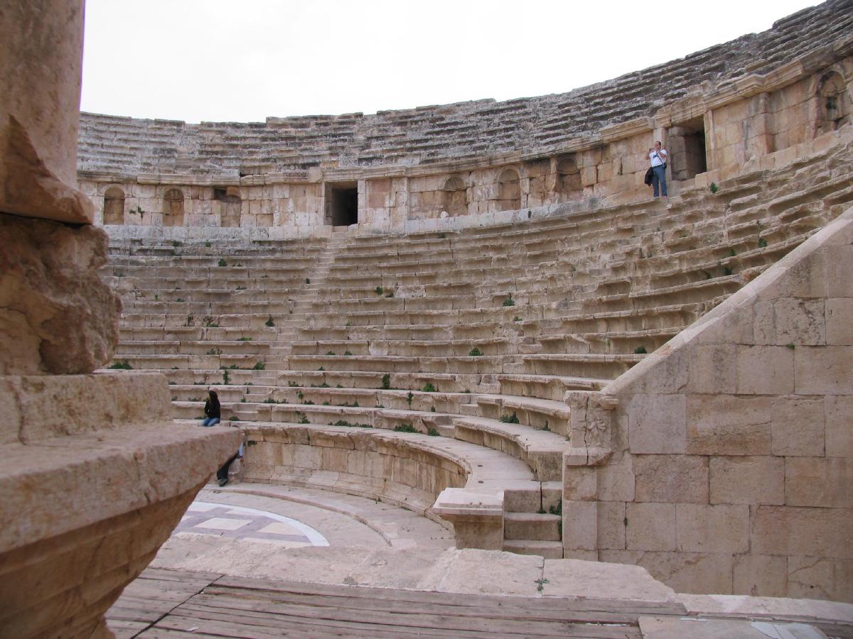 En el centro de Amman se pueden visitar el teatro romano, el foro y el odeón (siglo II d.c.). El foro y el odeón se hallan en frente del teatro y el estado de conservación es excelente. Se puede dedicar entre una y dos horas dependiendo de si se visita el pequeño museo del folclore y el de las tradiciones, que se encuentran situados justo al lado del teatro. El teatro suele ser un lugar tranquilo al que acuden pocos visitantes. En el norte de Jordania podemos encontrar los restos de la ciudad de Gadara (Umm Qais actualmente) y los restos de la ciudad de Jerash. Gadara se encuentra situada a unos 100 Km de Amman con vistas a los altos del Golán. En Gadara los restos de la villa otomana se superponen a los restos de la ciudad romana. El estado de conservación de los restos romanos no es muy bueno, pero como se encuentra en una colina el paisaje de los alrededores es muy hermoso. De vuelta a Amman nos paramos en la ciudad de Jerash situada a unos 50 Km al norte de la capital. En Jerash se hallan los restos de la ciudad romana de Gerasa, una de las ciudades de la decápolis. Jerash destaca por el excelente estado de conservación de las ruinas. La visita al atardecer proporcionar una luz excelente que da a las piedras un color rosáceo. La ciudad romana es enorme por lo que se puede pasear tranquilamente durante dos o tres horas. Una de las partes que más me gustaron fue la plaza oval o foro y el teatro del norte. En el sur de Amman, en la ciudad de Madaba, se puede visitar la iglesia ortodoxa de San Jorge, donde se halla el famoso mosaico que representa un mapa de oriente medio y Egipto con Jerusalén en el centro, el mar muerto con los peces que huyen, el Karak etc.