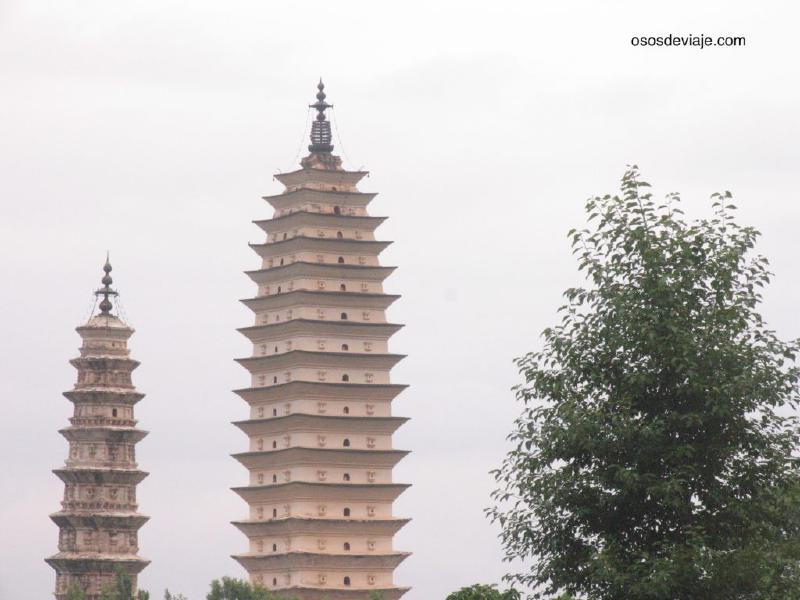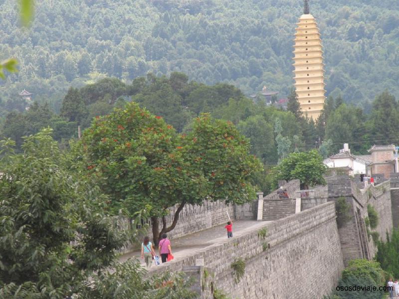 Entre las visitas que se pueden hacer en Dali y en sus proximidades, destaca el recinto del templo Chongsheng y las tres pagodas (San Ta) situado a una media hora andando del centro de Dali en dirección noroeste (también se puede tomar el autobús 19 en Boai lu hasta las pagodas por un yuan). Aunque a primera vista puede parecer que el recinto es pequeño, en realidad se trata de un complejo enorme donde las pagodas forman una pequeña parte. La pagoda más antigua de las tres llamada “qianxunta” data del siglo VIII. Hay que dedicar medio día para visitar este complejo y conviene ir temprano (abren a las 7 de la mañana) porque enseguida se llena de grupos de turistas chinos. La entrada al complejo no es barata, cuesta 120 yuanes (la mitad con carnet de estudiante e incluso se puede entrar gratis si se camina un trecho por la calle que sube hacia el monte en el extremo norte del parque, pasado el hotel hay un callejón que entra directo… si nadie vigila te puedes colar, pero no se lo digáis a nadie :-D).