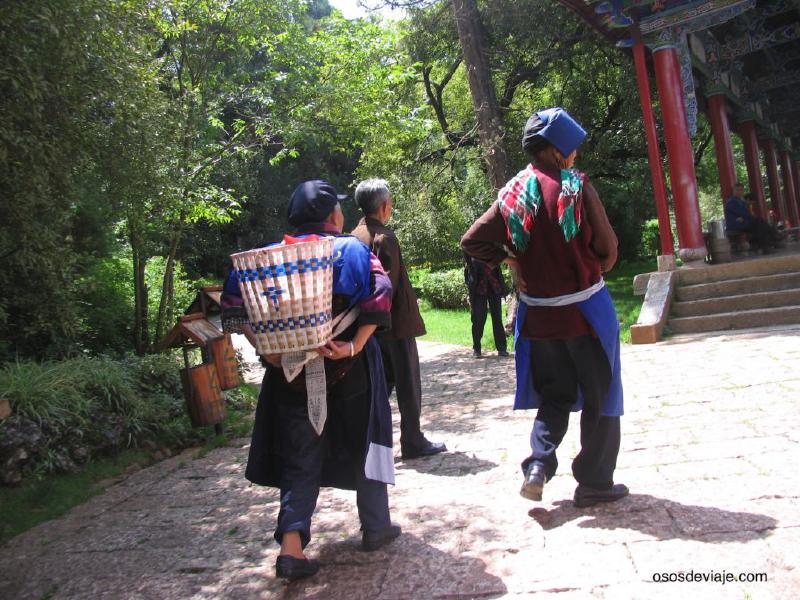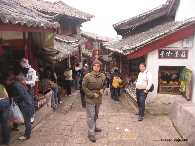 Llegamos a la estación de autobuses del sur de la ciudad de Lijiang (en Changshi lu) a medio día y a partir de aquí empezamos nuestra odisea para llegar a nuestro hotel en la ciudad antigua de Lijiang. La ciudad antigua de Lijiang, también conocida como la ciudad de Dayan, es un laberinto de callejuelas adoquinadas a ambos lados de las cuales hay casas bajas de dos o tres pisos construidas en piedra con los tejados típicos orientales. En medio de este laberinto de calles estrechas, recorren la ciudad de norte a sur una serie de canales que transportan agua desde el estanque del Dragón Negro a la ciudad. La ciudad de Dayan es el hogar de más de 6000 familias de la minoría étnica de los Naxi, una de las minorías que cuenta con un sistema propio de escritura, diferente al de los Han, basado en pictogramas. Este sistema de escritura es conocido como Dongba wen y se puede visitar el instituto de estudios Dongba en el parque del Dragón Negro al norte de la ciudad antigua. El agua es un elemento muy importante para los Naxi, puesto que la deidad que ellos conocen como “Shu” habita en el agua. Esta proximidad a la naturaleza, hace que los naxi sean un pueblo que intenta vivir en armonía con la naturaleza y no explotar sus recursos de manera indiscriminada. Otra característica de los naxi es que son una de las pocas sociedades matriarcales que quedan en el planeta.