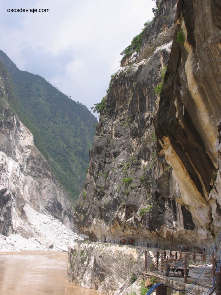 Más abajo se puede visitar la mítica garganta del tigre que salta. Se trata de un desfiladero por donde el agua del río baja con toda su fuerza. A uno de los lados de la garganta se ha excavado la roca para crear un camino que discurre junto al río. El recorrido hasta la zona de los rápidos dura una hora aproximadamente. Después hay que deshacer el camino hasta la entrada de la garganta. La garganta del tigre que salta se puere recorren utilizando dos rutas: la ruta fácil junto a la carretera, y una ruta más difícil que transcurrer unos metros por encima de la anterior, desde donde los paisajes son aún más espectaculares.