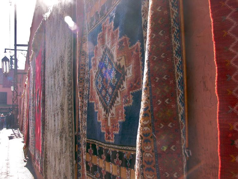 Por la tarde continuamos nuestro paseo por la medina de Marrakech, esta vez nos adentramos en los zocos. Los zocos están organizados en barrios o sectores según los diferentes oficios. Así, encontramos el zoco de las babuchas, el de los tintoreros, el del cobre o el del cuero entre otros. Pasear por los zocos es una auténtica experiencia, el bullicio y la actividad comerciante son la tónica. Si queréis comprar algún recuerdo, sin duda los zocos son el lugar ideal. Se vende casi de todo: desde babuchas, bolsos, chilabas, hierbas medicinales, frutos secos, y como no alfombras. Es imprescindible tomar se el tiempo necesario para el regateo, no se puede ir con prisas!. Y si ofrecéis un precio justo ambas partes quedarán satisfechas. Una de las cosas que más me sorprendieron agradablemente es la amabilidad de los comerciantes de los zocos (no tanto en las tiendas y paradas más cercanas a la Plaza). Por la tarde, al anochecer, regresamos a la Plaza. El ambiente era totalmente diferente. El centro de la plaza había sido invadido por un montón de puestos de comida en la calle. La comida es expuesta en cada parada y se prepara allí mismo. Pinchos de pollo y de ternera, pescado, cabezas de cordero, caracoles etc. Y por supuesto cenamos allí. En el chiringito donde cenamos nos ofrecieron una carta con los precios de los productos. No obstante, después de pedir lo que queríamos comer, parece que es habitual que te vayan trayendo tapas. Si no estáis dispuestos a pagar por ellas debéis decir que se las lleven. Ya estáis avisados. A nosotros nos avisó nuestro amigo Álvar el gran viajero y como todos sus consejos resultó muy útil.