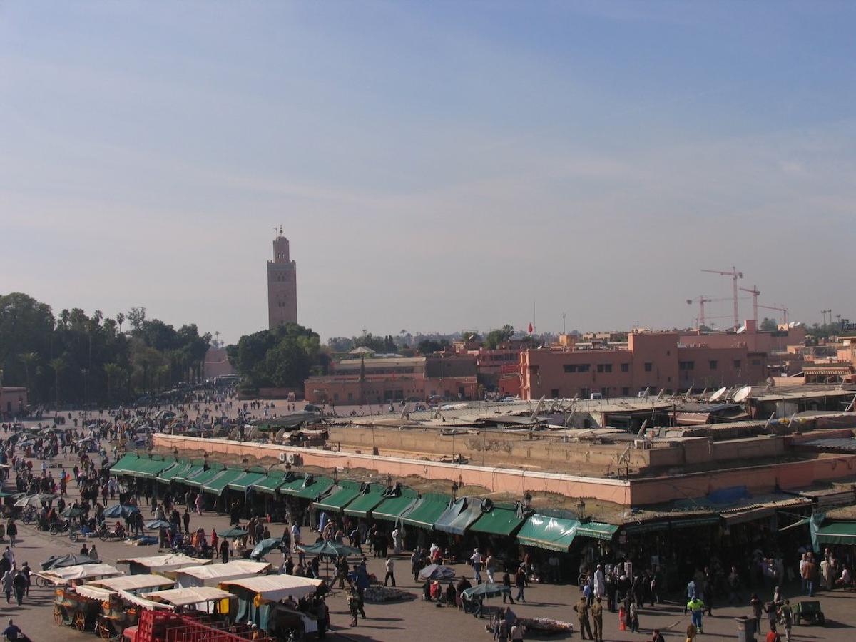 Nuestro amigo Toni nos comentó que hay que pasear por la plaza del Djemaa el Fna en diversos momentos del día, y así lo hicimos. Nada más levantarnos, nos dirigimos a través de la avenida de Mohammed V en dirección a la Kutubia, el alminar que se ve desde cualquier parte de la ciudad. En nuestro camino atravesamos las murallas que rodean la ciudad antigua. La Kutubia se halla muy cerca de la plaza del Djemaa el Fna por lo que fue nuestra primera parada. Se trata de uno de los edificios construidos por los Almorávides en su expansión hacia el norte (siglo XII) y sigue el modelo de la Giralda de Sevilla. Finalmente llegamos a La Plaza. Allí encontramos encantadores de serpientes, saltimbanquis, contadores de cuentos, mujeres que hacen dibujos con henna y diversos puestos donde se venden dátiles y otros donde se puede tomar un zumo de naranja recién exprimido por unos 10 dirhams. Alrededor de la plaza hay un montón de cafés y terrazas donde se puede hacer una parada, tomar un te a la menta y contemplar el deambular constante de gentes.