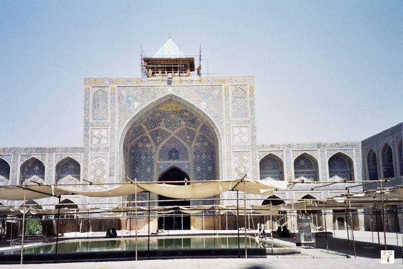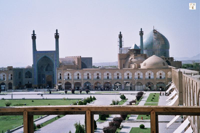 La mezquita del Imán, con sus minaretes cubiertos por azulejos azules, es sin duda una de las obras maestras de Sha Abbas. El complejo de esta mezquita es enorme e impresionante, y tiene la particularidad de que el edificio no está construido siguiendo el mismo eje que tiene la puerta principal de entrada que da a la plaza del Imán. Si se mira un plano aéreo de la mezquita se ve que el eje está inclinado 45 grados respecto al eje de la entrada principal. Este desvío es debido a que fue necesario orientar el mihrab de la mezquita hacia la Meca puesto que la plaza no seguía esta orientación.