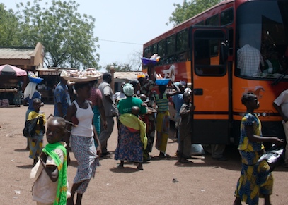 Estamos donde los autobuses de linea entre Ouaga (capital de Burkina Faso) y Bobo (ciudad económica hacia donde nos dirigimos). Mi sombrero North-Face de aire australiano mi piel rosada y la pinta de despistado me convierte en una de las atracciones. Lástima que María José se niega a empuñar la Canon y retratarme, ya que seguramente yo soy la atracción aquí. Niko me lo confirma: tengo una pinta de “guiri” muy cuidada. La esplanada de tierra rojiza abrasada por el sol de mayo en África se encuentra rodeada por un par de docenas de tenderetes en los que se venden bebidas, frutas y verduras, las galletas de sésamo, pan de bagette y asados de pollo, cordero, pescado y otras carnes que no identifico y no quiero indagar más. Huele de maravilla. Pero con este calor sólo me apetece mi cocacola y quizás unas gelletas de sésamo de vuelta en el autocar. Desde el que tecleo con el macbook en las rodillas a salvo del calor gracias al are acondicionado.