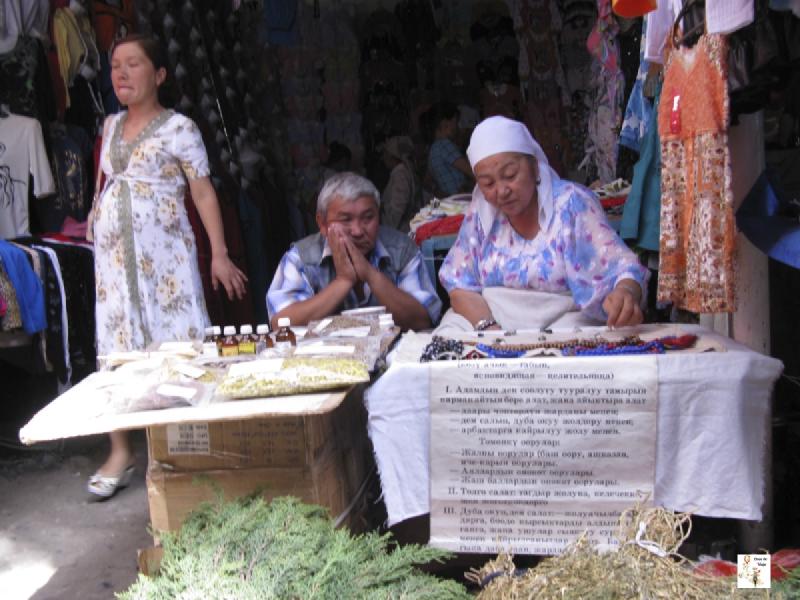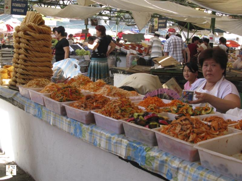 Siguiendo en dirección norte, por un camino que se encuentra junto al edificio del Museo de Historia, se llega al parque Dubovy, uno de los principales parques de la ciudad. Algún que otro café, esculturas al aire libre y una pequeña exposición de pinturas de artistas locales es todo lo que hay en el parque. El parque es un lugar muy tranquilo para pasear o descansar. Otra plaza interesante es la plaza de la Victoria, cuya construcción fue completada en 1984. El monumento principal de la plaza es una construcción en forma de yurta, con una mujer esperando el retorno de su marido de la guerra junto a la llama eterna. Por último, como la mayoría de ciudades de Asia central, Bishkek cuenta con diversos bazares. Nosotros visitamos el más famoso de la ciudad: el bazar de Osh. Se trata de un bazar donde se venden todo tipo de productos de diversa procedencia, principalmente china. Una de las secciones más interesantes es la de productos alimentarios. Allí probamos el “kuruk”, unas bolitas de queso muy saladas que se toman como snaks.