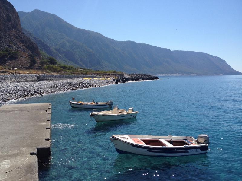 En nuestro segundo viaje a Creta fuimos a una boda griega que se celebró en Agia Roumeli, una remota cala a la que se llega o bien en ferri o bien haciendo un trekking de unas 4 ó 5 por la garganta de Samaria. Con el calor de finales de julio decidimos llegar a Agia Roumeli en ferry desde Hora Sfakion. Agia Roumeli cuenta con un pequeño pueblo y una bonita playa de piedras oscuras. Al atardecer, cuando baja el calor, nuestro peque disfrutó mucho en la playa. También le gustó mucho ver como llegaban los barcos (ferris) y como descargaban vehículos, mercancías y motos. Es una cala muy tranquila y apartada para ir con niños. En Agia Roumeli nos alojamos en Artemis Studios.