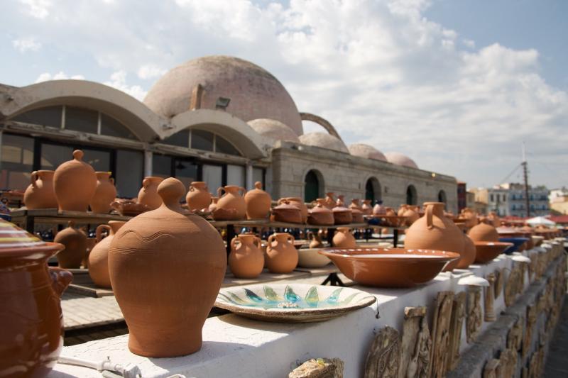 Otro edificio emblemático del puerto de Chania es la mezquita de Kioutsouk Hasán, también conocida como la mezquita de los jenízaros. Cuando visitamos la ciudad, en su interior, había una exposición de pintura y en las terrazas del exterior tiendas de cerámica.