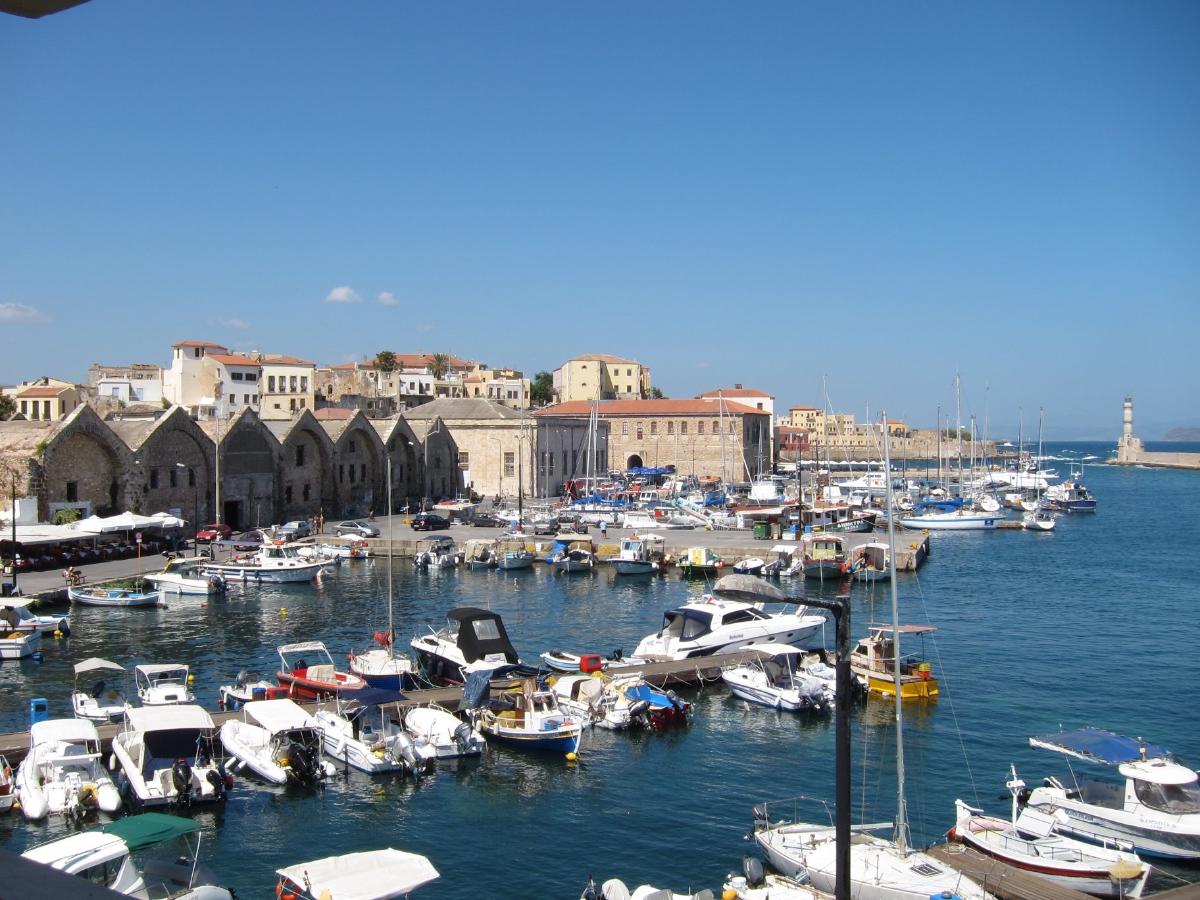 La ciudad de Chania es curiosa porque es un cruce de civilizaciones. Por aquí pasaron árabes, bizantinos, venecianos y genoveses entre otros. Y eso se ve en los edificios del puerto. El puerto está protegido por un espigón y un faro. La parte más oriental del puerto, se conoce como el puerto veneciano, en honor la la influencia veneciana en la zona. En el puerto veneciano se puede visitar el museo naval situado en unas antiguas dársenas. Caminando en dirección oeste existe otro conjunto de dársenas, estas últimas, utilizadas como almacenes.