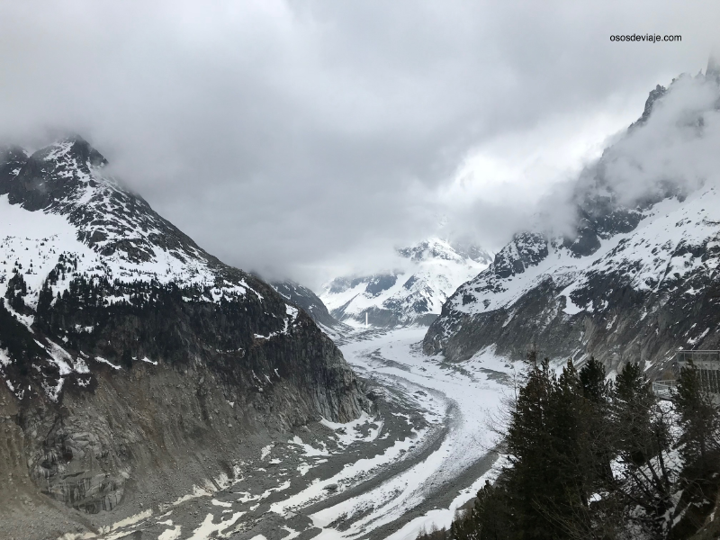 Para visitar el Mer de Glace hay que atravesar la ciudad de Chamonix para llegar a la estación de Montenvers. Allí se compran los billetes para el tren cremallera que en unos 20 minutos asciende la montaña para acabar a 1930 metros de altitud. Una vez en la cima, está nublado, la niebla lo tapa todo no se ve nada. O sea que nos vamos directamente hasta el telecabina que nos bajará hasta las escaleras que descienden hasta el glaciar. Una vez salimos del telecabina se divisa claramente el glaciar, o más bien, la ausencia de el. Se puede ver claramente como a lo largo de los años el nivel del mar de hielo ha bajado sin parar. El paisaje, ahora si es sobrecogedor. Descendemos las escaleras para llegar a la entrada de la gruta de hielo. No es ni más ni menos que un preciso túnel excavado en el glaciar.