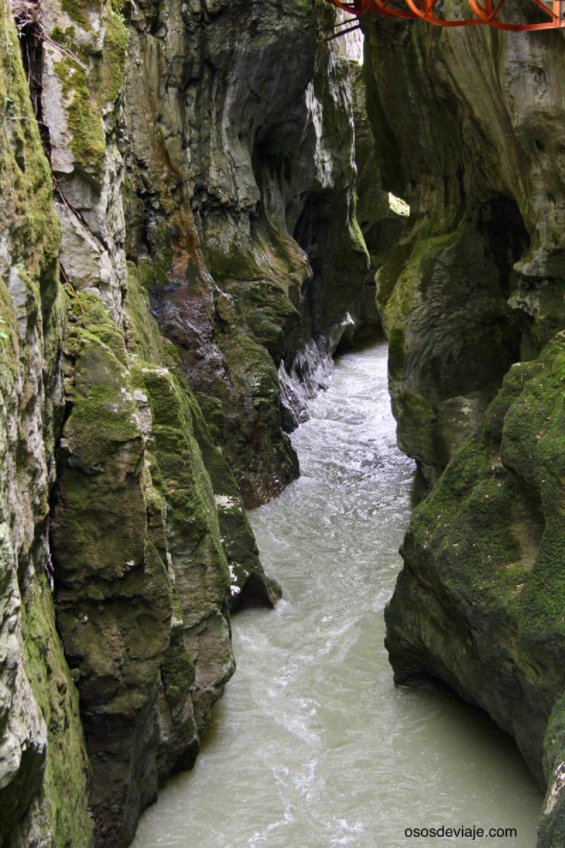 La garganta de Fier está situada a cinco minutos del castillo de Montrottier. Como a nuestros hijos no les gustan mucho los castillos, decidimos visitar solo la garganta. La garganta de Fier es un estrecho desfiladero por el que se camina a través de un puente suspendido a unos 25 metros de altura. El recorrido es lineal. Es decir, hay que recorrer la garganta y llegar al final de cañón donde hay unos paneles explicando el origen y formación de la garganta. Al final nos encontramos una enorme zona de rocas gigantes llamada “La mer de Rochers”. Para salir de la garganta hay que deshacer el camino. Al hacer esta visita en primavera no hemos encontrado mucha gente en la garganta. Hemos podido caminar por la estrecha pasarela sin encontrar muchedumbres. Desconocemos como debe ser en verano. La garganta es accesible para todos los públicos. Eso si, está prohibido llevar a los pequeños encima de los hombros por el peligro que eso conlleva. No se necesita un calzado especial, aunque pensamos que es mejor llevar zapatillas con una suela preparada para terreno rocoso.