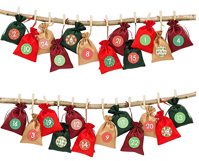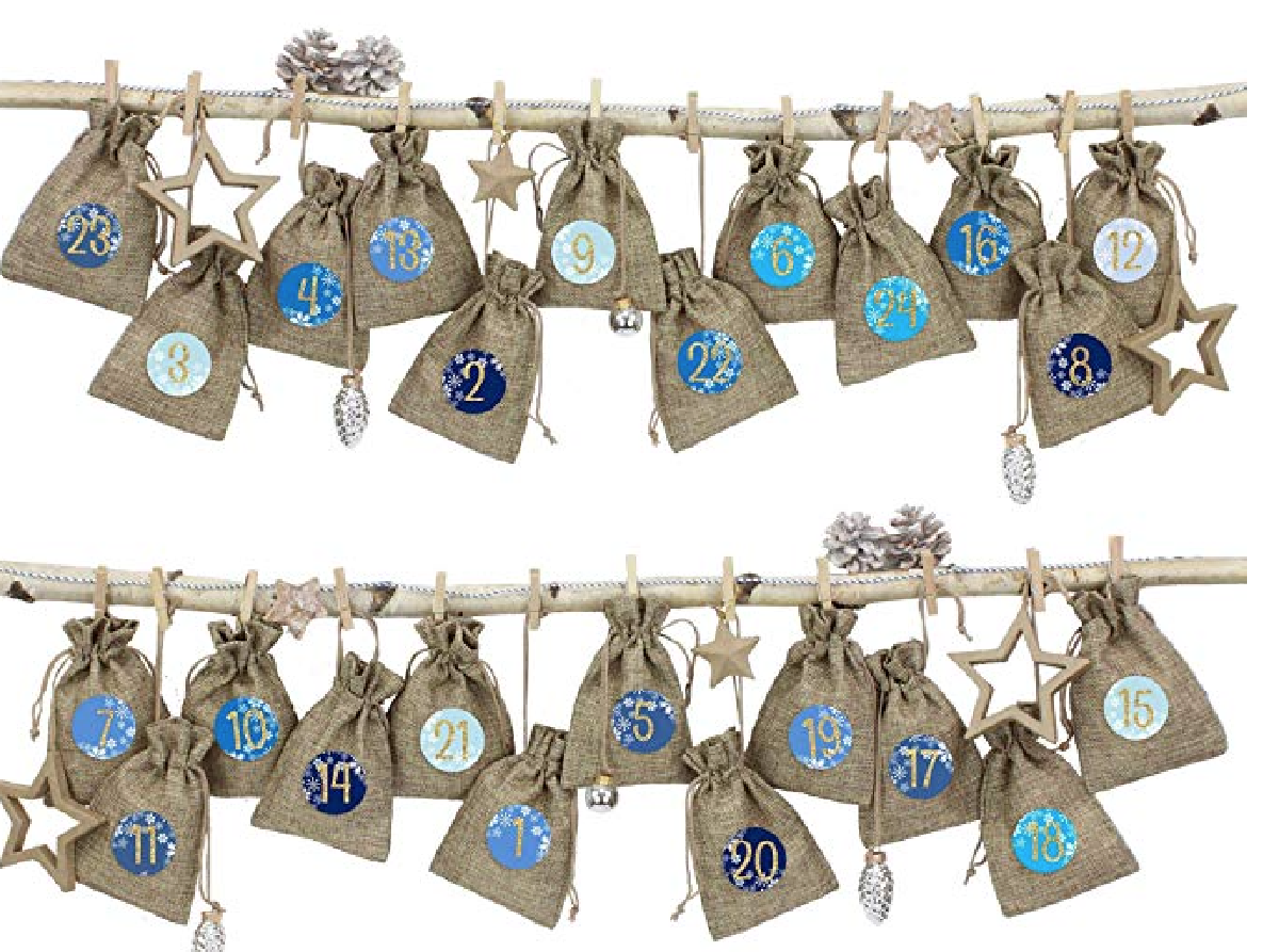 Las sorpresas las he guardado en 24 bolsitas de yute o de tela como estas. Las sorpresas las he colocado en las bolsitas de forma aleatoria con una nota que contiene una pista de lo que hay en cada bolsita. Los saquitos del calendario los hemos numerado porque nuestros hijos conocen los números. Si los niños no saben leer aún, se puede leer cada pista en vez de que la lean los niños.