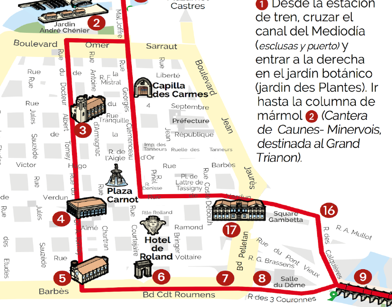 Tras dejar el barco, había parado de llover, por lo que pudimos pasear un rato por la ciudad. En el mapa siguiente podéis ver una ruta a pie parecida a la que nosotros hicimos por la ciudad. Además era sábado por la mañana, día de mercado en Carcassone, por lo que nos detuvimos a comprar castañas e higos. De allí, nos dirigimos de vuelta a nuestra casa que estaba situada a los pies de la Cité.