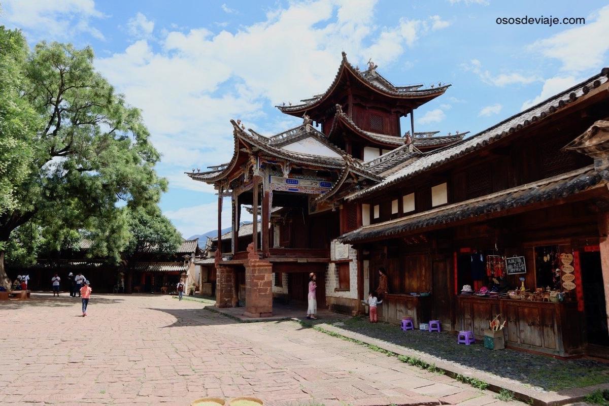 Indiscutiblemente, en la antigua plaza del mercado es donde durante siglos se concentró el centro de la actividad comercial del pueblo. En la actualidad, el mercado ha sido trasladado a otra ubicación y la antigua plaza conserva el edificio del teatro restaurado como uno de los más emblemáticos. La plaza está rodeada de pequeños comercios y bonitos edificios de madera y barro de color ocre. El templo Xingjiao es el único templo budista de los bai.