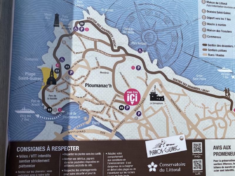 A la salida del aparcamiento hay un mapa que te permite ir hacia el GR-34, que es donde están las rocas de granito rosado. La parte de camino que hicimos nos llevó por la costa hasta el faro Mean Ruz y de allí hacia la playa de Saint-Guirec. En la propia playa hay un pequeño oratorio, que parece flotar en el mar con la marea alta y está dedicado a Saint Guirec. Desde la playa seguimos nuestra excursión hasta el cercano puerto de Ploumanac’h.