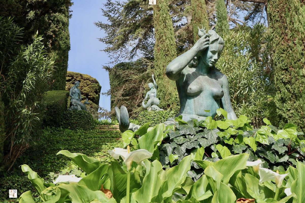 Además del verde como color predominante, otro elemento importante del jardín son las esculturas. Destacan el grupo de sirenas en bronce y diversos bustos en mármol de estilo neoclásico.