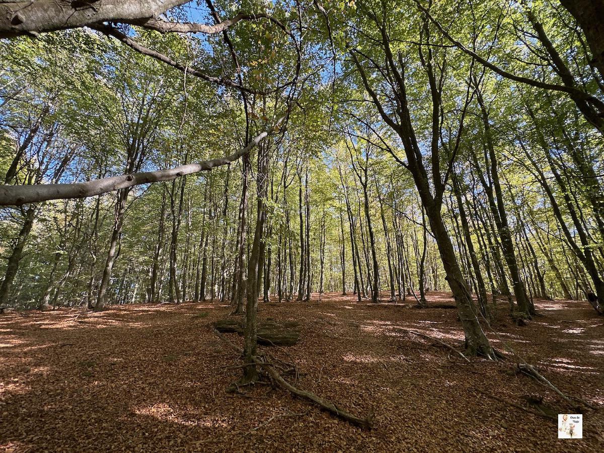 Después del prado, se llega al bosque de hayas. Siguiendo el camino por el bosque hay que encontrar una indicación que nos hace girar hacia la izquierda para ir a la zona de las Rocas Encantadas.