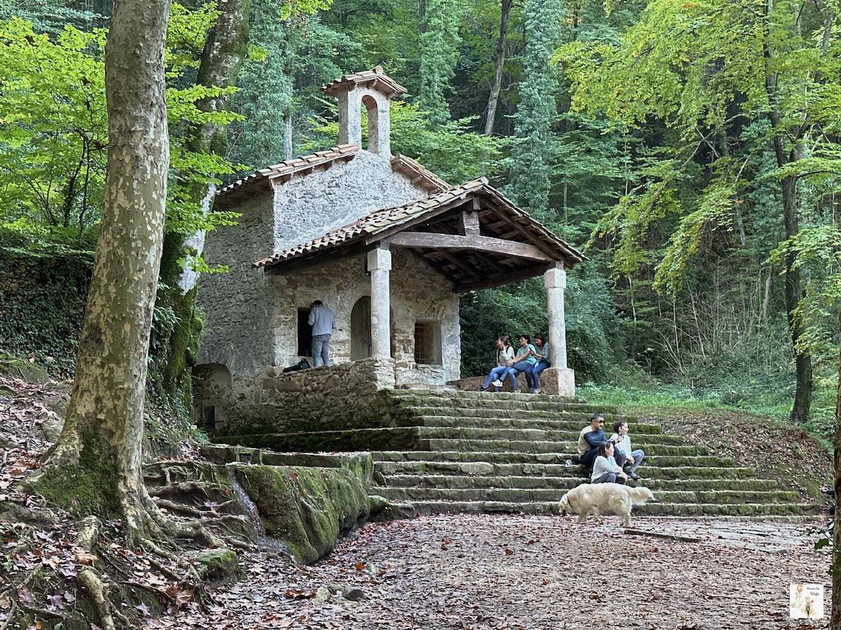 Más adelante, ignoramos un desvío a la izquierda y seguimos ascendiendo. Al llegar a una zona pedregosa, es importante tener precaución en días húmedos. El sendero se adentra en un hayedo y cruza dos pequeños arroyos sin dificultad. Tras avanzar un poco más, conectamos con un camino más amplio que nos lleva entre helechos hasta que llegamos a la primera ermita.